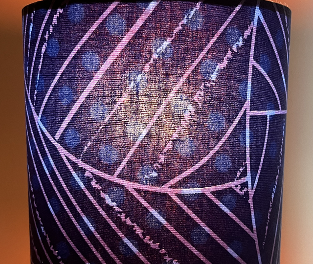 A solid blue wave like pattern on the outside is lined with a red fabric with white dots. This gives a pretty and unusual glow.