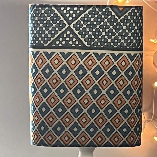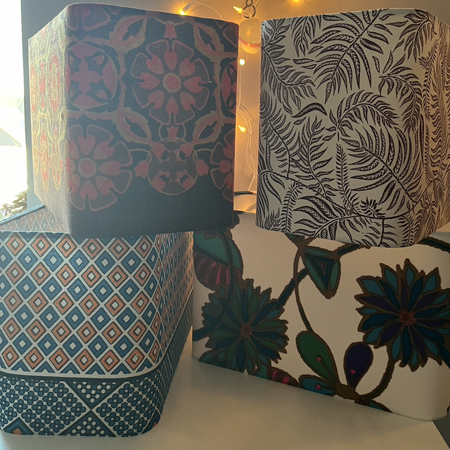 Rectangular lampshade made with a striking blue & orange vintage fabric with a diamond & abstract flower pattern.