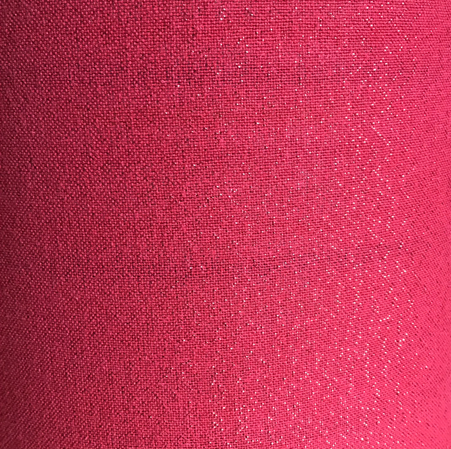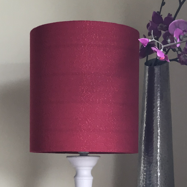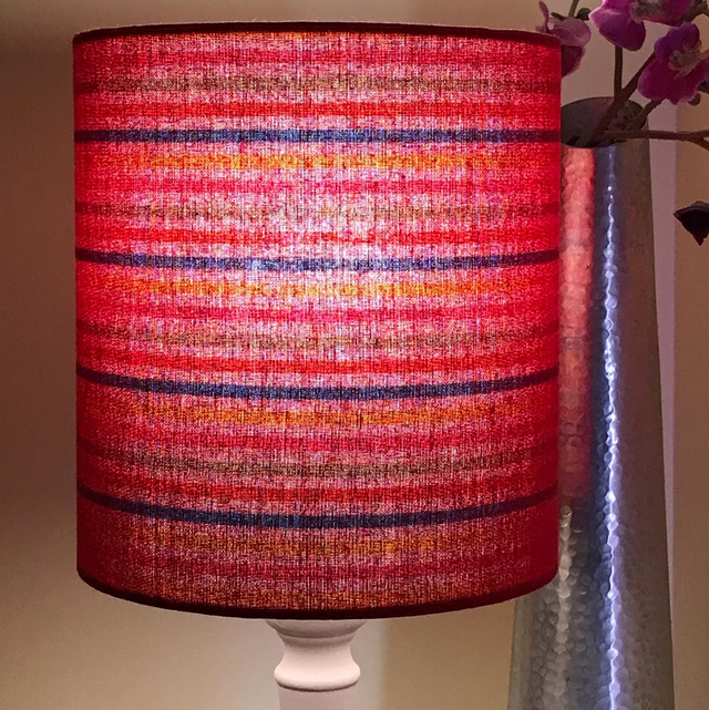 A hand made double sided lampshade. The outer fabric is red with a gentle sparkle. When the bulb is switched on this beautiful lampshade not only shows through a gorgeous striped pattern but also glimmers a little more. Perfect for adding colour and sparkle to any room.