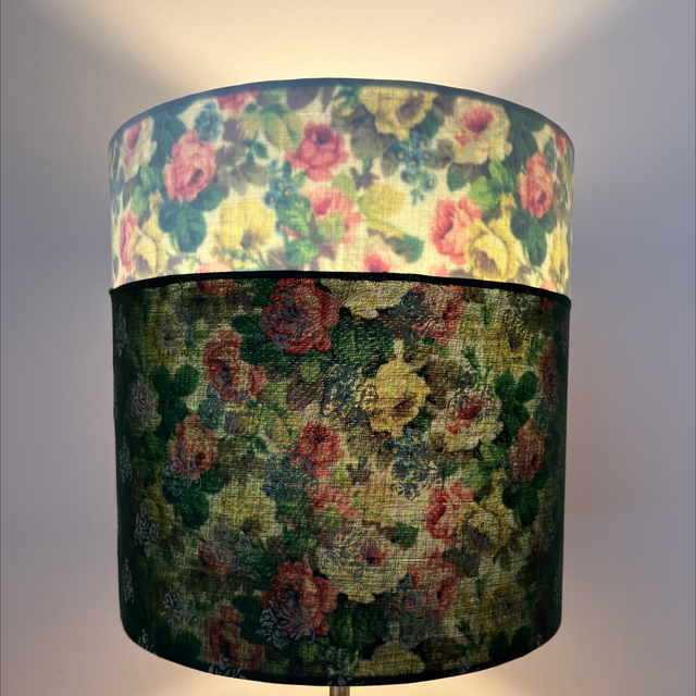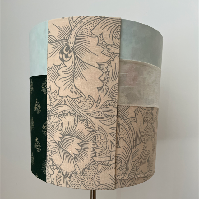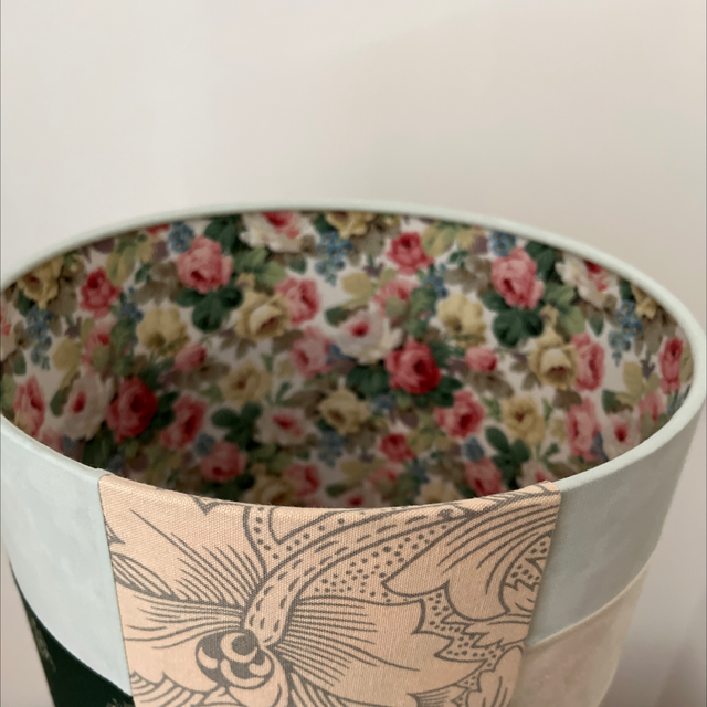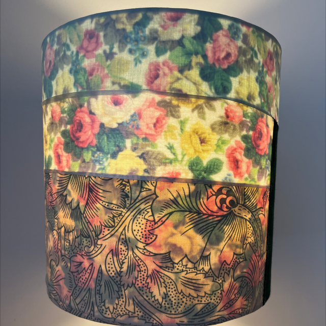 Rose patch is a delightful & unique double sided lampshade, a true one off piece .The outer is a mix of green & cream, plain & patterned including a William Morris pattern. It is lined with a Sanderson print rose fabric. Hints of the inner fabric are just visible when the bulb is switched off but the full pattern pops through when the bulb is on. This is suitable for a lamp or a pendant fitting. All Loxo Lampshades are made by hand with a high quality finish. All products meet industry standards.