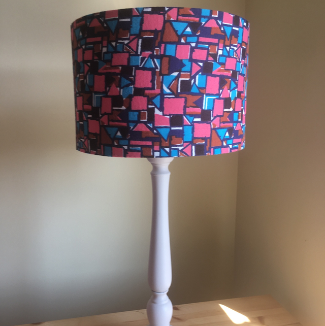 This lampshade is is made from a soft vintage cotton. The abstract pattern is in a lovely range of pink and blue tones. It would add a pop of colour to any room.