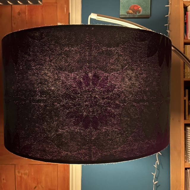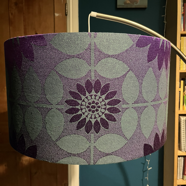This beautiful vintage textured fabric has a satin type detail for the purple flower & a grey/green cotton feel on the leaf elements. This is a single sided lampshade on plain white backing for maximum light as the fabric is impactful without addition.