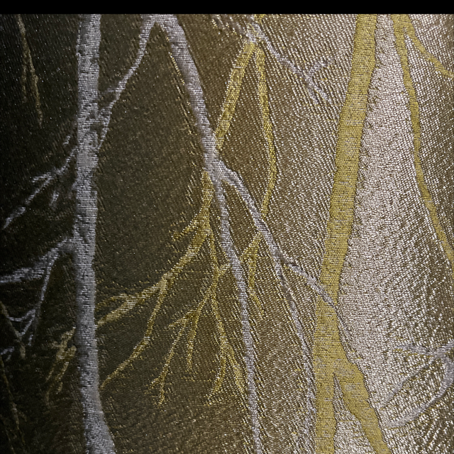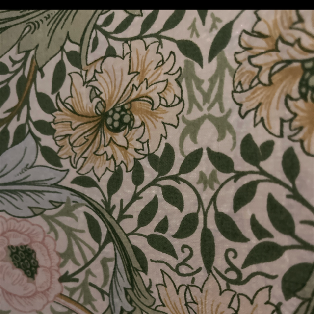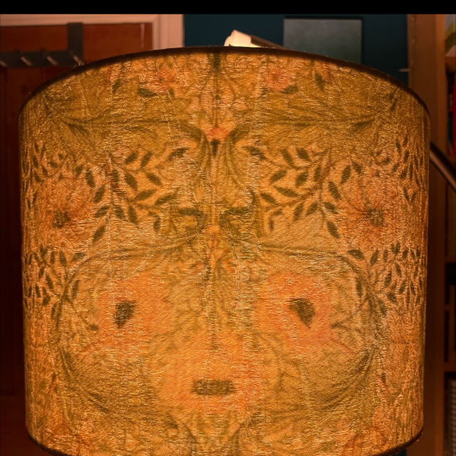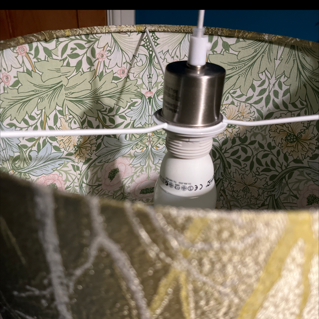 the outer fabric is a green/gold colour with a textured tree/branch detail. This lampshade is lined with a vintage Wm Morris design in cream, green, pink & blue shades. When a bulb is switched off only the textured fabric is seen but once a bulb is switched on the Wm Morris design glows through with a subtle golden hue.